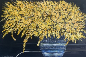 2025The flowers, painted in thick, rhythmic impasto, seem not to merely rest but press forward, crowding the frame, vibrating with presence. Each stroke—short, deliberate, and sculptural—suggests not petals but flames, leaves, memory fragments. “Golden Silence” is not about a bouquet. It is about abundance within solitude, about holding beauty even in isolation, and about finding radiance in the absence of words.